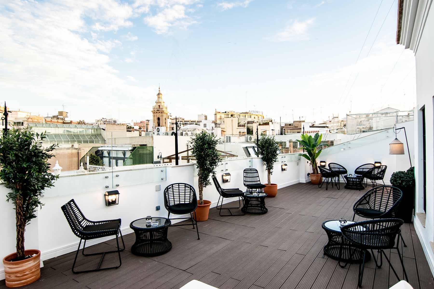 Aun­que nos encan­tan las terra­zas a pie de calle, muchos edi­fi­cios de Valen­cia tie­nen en sus azo­teas impre­sio­nan­tes terra­zas con vis­tas des­de las que casi se pue­de tocar el cie­lo. Es el caso del recién inau­gu­ra­do NH Collec­tion Colón Valen­cia, que aca­ba de estre­nar su terra­za Green Roof Top en la sép­ti­ma plan­ta del hotel. Se tra­ta de un espa­cio en el que dis­fru­tar de los atar­de­ce­res de verano con las mejo­res vis­tas de la ciu­dad acom­pa­ña­das de una selec­ción de snacks y bebi­das que se sir­ven en la isle­ta cen­tral de la azo­tea. La terra­za tam­bién ofre­ce una car­ta de cóc­te­les selec­cio­na­dos entre las pro­pues­tas que se sir­ven en el bar Caraa­ca­ra, que se encuen­tra den­tro del hotel y cuyas com­bi­na­cio­nes están dise­ña­das por el cono­ci­do mixó­lo­go Die­go Cabre­ra. Entre ella des­ta­can el Oran­ge Blos­som (cachaça, lima fres­ca, fru­ta de la pasión, agua de azahar y spri­te) o la Palo­ma (tequi­la blan­co, zumo de lima y refres­co de pome­lo).