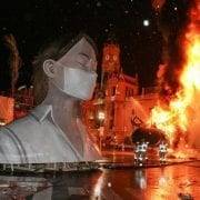 Sin público, con apenas unos bomberos controlando el fuego y un cordón policial, la falla de la Plaza del Ayuntamiento se redujo a ceniza. Aunque no toda. Se ha reservado la icónica cabeza de una mujer con su mascarilla como símbolo de resistencia ante el coronavirus con la esperanza de que pueda arder la noche del 19 de julio, la fecha que las autoridades proponen para la otra Cremà de las Fallas 2020.