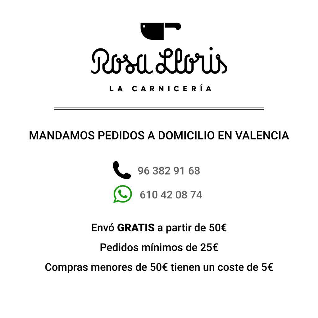 De la misma manera, Rosa Lloris Carnicería realiza reparto a domicilio en Valencia con pedidos mínimos de 25 euros. Las compras menores de 50 euros tienen un coste adicional de 5 euros, mientras que a partir de 50 euros de compra, el envío es totalmente gratuito. Haz tu pedido en el 610 420 874.
