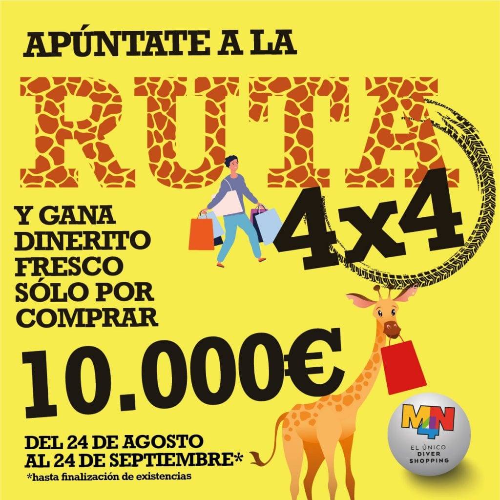 Los clien­tes podrán lle­var­se tar­je­tas rega­lo de has­ta 45€ para gas­tar en el cen­tro solo por pre­sen­tar, a tra­vés del enla­ce (https://mn4.com/ruta4x4/), los tic­kets  de sus com­pras (con gas­to míni­mo com­pren­di­do entre los 15€ y los 30€) en algu­nos de los esta­ble­ci­mien­tos de ali­men­ta­ción, res­tau­ra­ción, moda, com­ple­men­tos, ser­vi­cios y ocio de MN4, siguien­do una de las cua­tro rutas que más se ajus­ten a su con­su­mo: Ele­fan­te (ali­men­ta­ción, res­tau­ra­ción y ocio), Arma­di­llo (ocio, moda y res­tau­ra­ción), Leo­par­do (ali­men­ta­ción, moda, com­ple­men­tos y ser­vi­cios) y Zebra (ocio, res­tau­ra­ción, com­ple­men­tos y ser­vi­cios).
