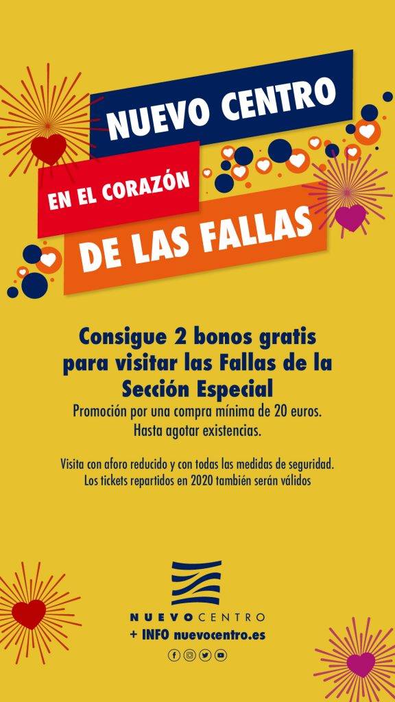 Por ello, como en ediciones anteriores, todos los clientes que acudan a Nuevo Centro y presenten en el punto de información, situado en la plaza interior del centro comercial, tickets por una compra mínima de 20 euros realizada en Nuevo Centro, serán obsequiados con dos bonos para visitar las 9 fallas de la Sección Especial. Será válido tanto un solo ticket por un importe mínimo de 20 euros como varios que sumen esa cantidad mínima.