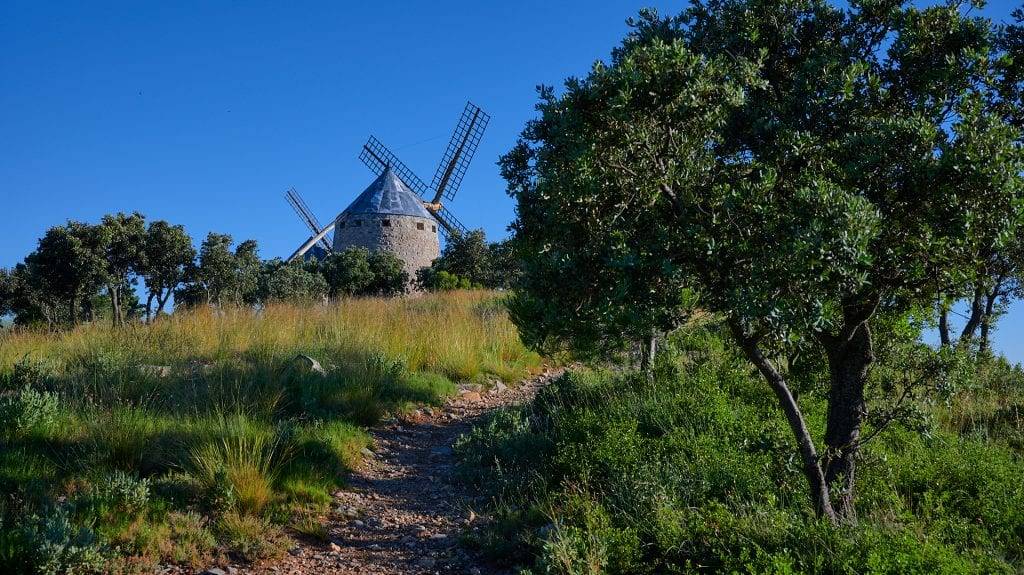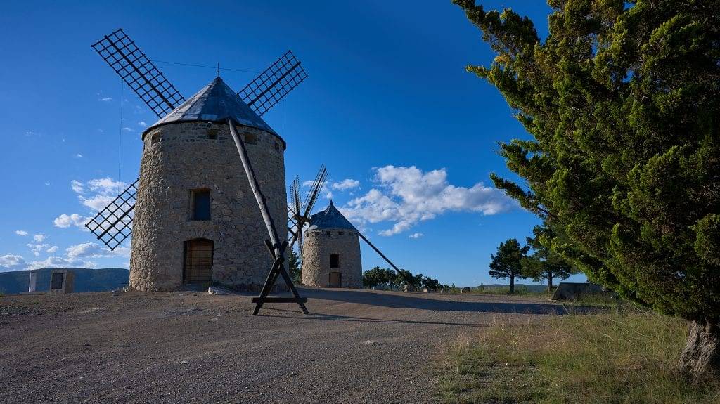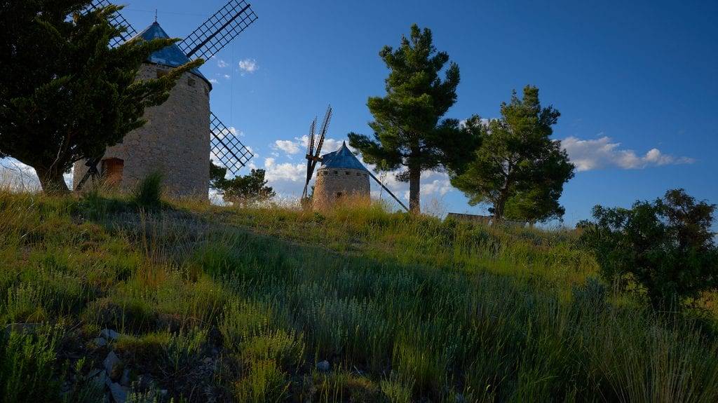 Hemos llegado a nuestro destino. Sobre el denominado Cerro de los Molinos encontramos dos molinos harineros del siglo XVII y los restos de la que fue la casa del molinero. Gracias a la documentación que se encuentra en el Archivo Municipal de Alcublas, se sabe que hasta el 1890 estuvieron en funcionamiento. En esta imagen puedes ver el estado en el que se encontraban en 1960. Han sufrido varios intentos de recuperación, pero por fin, en este 2020, se finalizó una intervención acorde a los materiales y usos originales de su construcción.