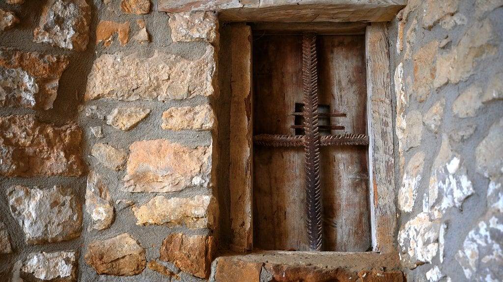 - Junto al Perxet hay una pequeña ventana enrejada, que me resulta sumamente diferente a todas las que he visto. Los barrotes están entrecortados, resultando sus bordes cortantes para evitar la entrada de animales indeseados.