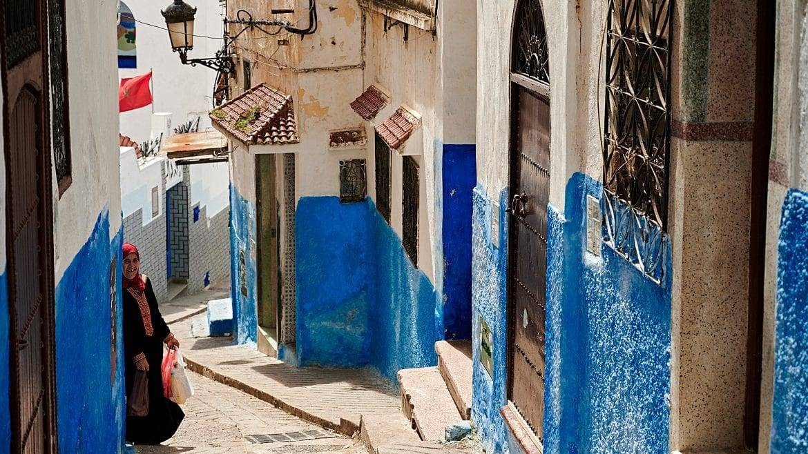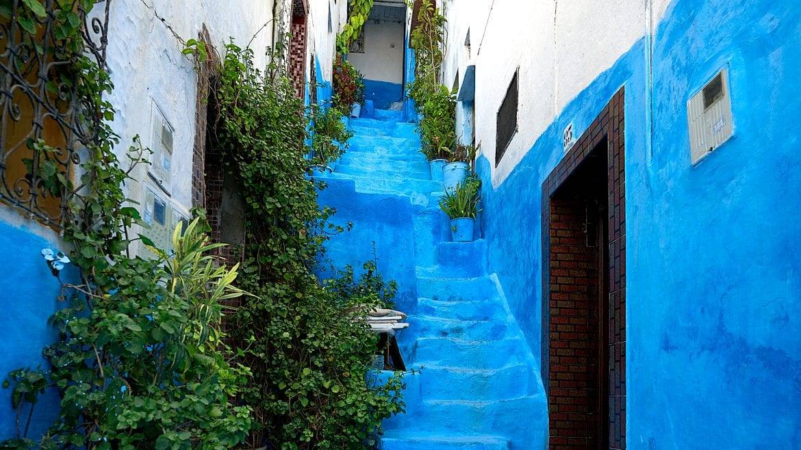 El ascenso lo harás por un barrio típico de Tetuán, con calles tortuosas y zigzagueantes, plenas de modestas casas encaladas perfectamente irradiando la blancura de la cal y el resplandor del azulete en sus escaleras.