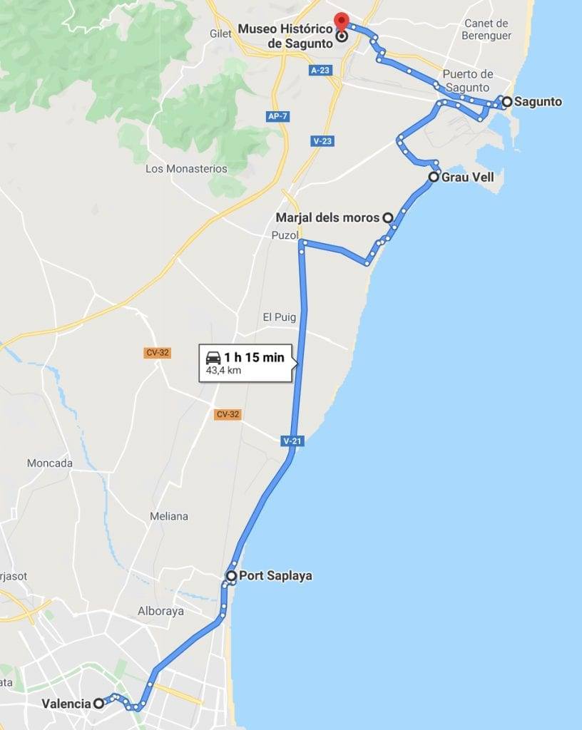 Saguntum, cuenta con cuatro magnificas playas, todas con bandera azul, hoy nos pararemos a descansar, por su cercanía, en la de Puerto Sagunto, donde podremos disfrutar contemplando el mar o tomando algo en su paseo marítimo.
