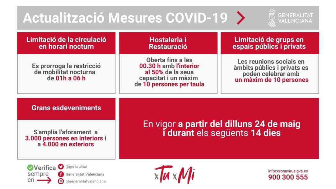 El president de la Generalitat, Ximo Puig indicaba que estas medidas responden a la intensificación de la fase de apertura progresiva que la Comunitat Valenciana inició hace dos semanas. “Hemos ido abriendo, y nuestra situación ha seguido mejorando”, ha indicado. En estos 15 días la incidencia ha bajado de 40 casos a 29,8 (por 100.000 habitantes en 14 días) y las hospitalizaciones se han reducido en un 54%.