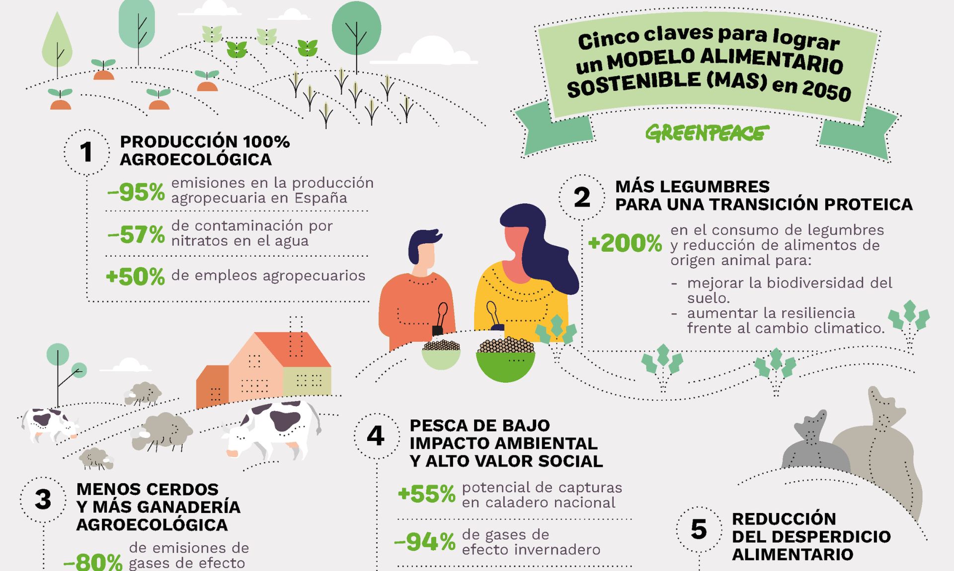 Como alternativa, propone un modelo 100 % agroecológico, que apuesta por el incremento de la producción y el consumo de legumbres, la ganadería extensiva, la pesca artesanal de bajo impacto y la reducción del desperdicio alimentario, todo ello bajo el marco de la denominada «dieta de salud planetaria». Según la organización, este modelo permitiría convertir el sistema alimentario en un sumidero de carbono, logrando una reducción neta del 116 % de las emisiones y generando un 35 % más de empleo vinculado al sector alimentario.