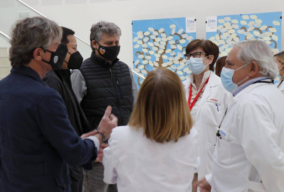 Hasta el Hospital La Fe se acercaron el presidente del Valencia CF, Anil Murthy, acompañado por los embajadores Ricardo Arias, Miguel Ángel Bossio y Miguel Tendillo, que fueron recibidos por la gerente del Departament de Salut València La Fe, la doctora Eva Salvo, junto con otros miembros del equipo directivo.