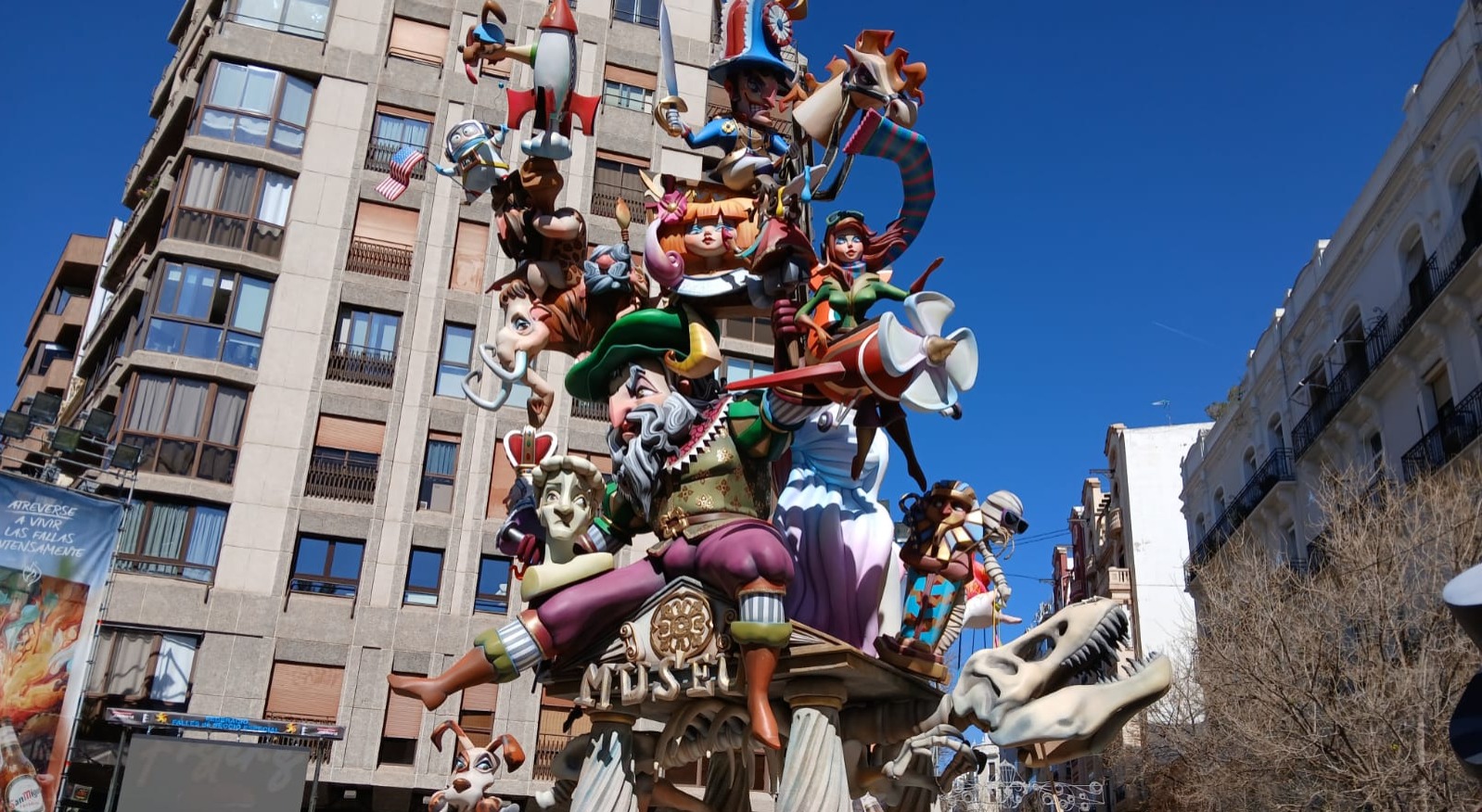 17:30 h.– «Cabalgata del Ninot. Con el siguiente itinerario: Salida de Glorieta, Calle La Paz, San Vicente, Plaza del Ayuntamiento, Marqués de Sotelo y final en la calle Xàtiva. Cerrará la Cabalgata la entrada de las primeras piezas de la Falla Municipal «Dos Palomas. Una rama».